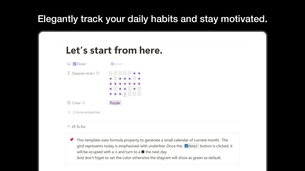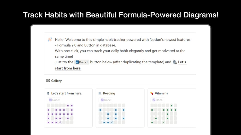 Discover a visually engaging way to track your habits with our Formula-Powered Habit Tracker. - Utilizing Notion’s latest Formula 2.0 and Button in database, this template creates a colorful grid calendar that elegantly displays your completed habits.